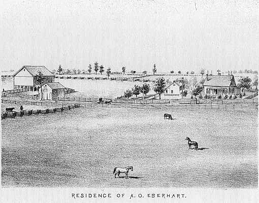 One of the later settlers in Donegal Township was Joseph EBERHART, who was born in Westmoreland County in 1800. He settled in Mercer County in 1823. He removed from there to Armstrong County, and from there to Kansas Territory (where he is still living, at the age of eighty-three years) when it was first opened to settlement. While in Butler and Armstrong Counties, he served as a colporteur for the America Tract Society. He raised a large family -- seven boys and six girls. John EBERHART, son of Joseph, came to Butler County with the family. He now resides in Fairview. He married Catherine BARNHART, daughter of Rudolph BARNHART, one of the pioneers of Donegal Township, and whose history is recorded in the chapter devoted to Donegal. Of a family of nine children, only three reached mature years -- Andrew O., Lewis D. and Jonathan A. . Andrew O. married Mary E., daughter of Phillip BARNHART, in 1873, and settled in Butler Township in 1844. [sic] They have one child -- Tessie Terrilla. Mr. EBERHART is one of the thrifty and successful farmers of the township. We present on another page a view of his home.