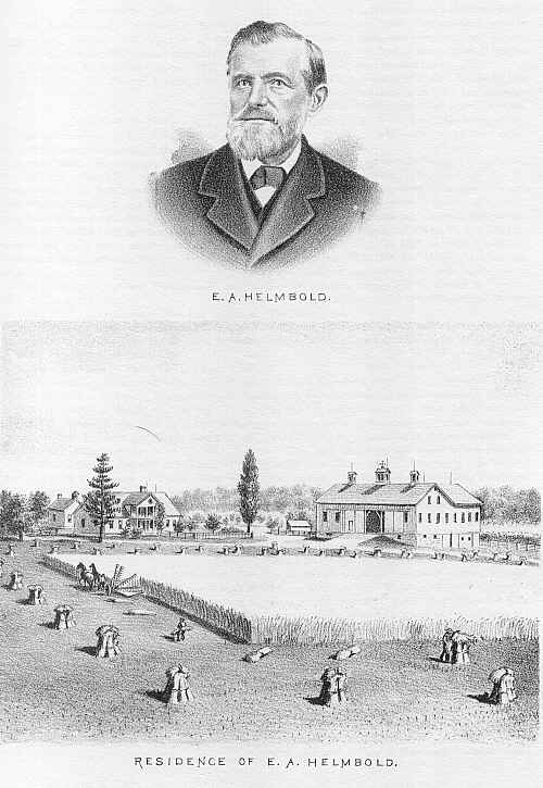 This gentleman, one of the most prominent citizens of Butler County, and especially of Jefferson Township, was born at Sunthausen, near Langensalza, Prussia, June 18, 1819. His father, John G. HELMBOLD, was a large land owner and sheep-grower in the locality mentioned, but, wishing to keep larger flocks than it were possible to do in Prussia, he visited the United States in the summer of 1834, intending to go to the great West in quest of good and cheap lands suitable for the purposes required. Reaching Pittsburgh in August of that year, his journey was delayed by reason of the unfavorable stage of water then prevailing in the Ohio River. He then concluded to visit Saxonburg, where many old friends from he [sic] Fatherland resided, and as a result his farther jouneyings westward were indefinitely postponed and he became the owner of 1,000 acres of land situated near the village of Saxonburg. He at once began improving his purchase, and the following year (1835) was joined by his wife and children, the latter named as follows: Earnest A., Emil, Pauline, who became the wife of August NAGLER; Nathalia, who married George SCHMIDT; Bertha, who married a Mr. BETTINGER, of St. Louis, Mo.; Othelia, who married Gotlieb STARKE; Mina, who married Frederick STARKE; Matilda, who died as the wife of Charles SCHREPPERD; Emma, who married Louis BIEHL; and Theodore, now a merchant in Saxonburg.