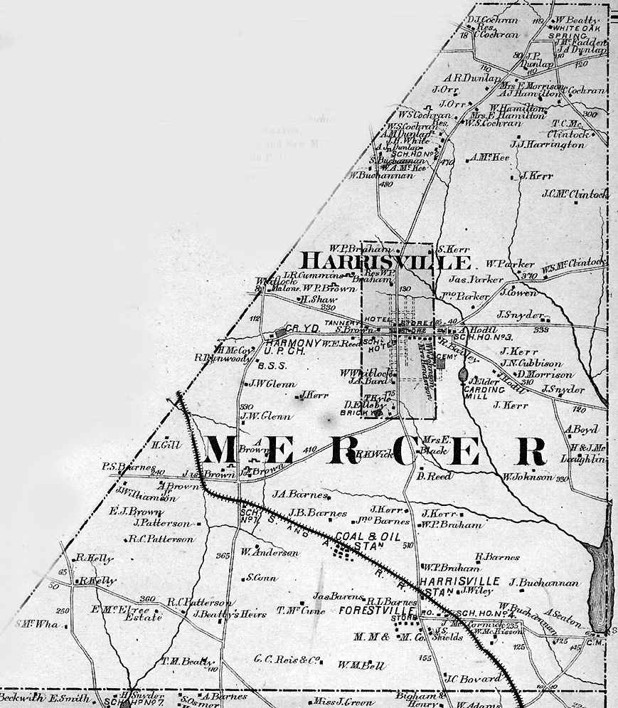 William GILL, one of "Mad Anthony's" Irish soldiers in the Revolution, located on Wolf creek in 1802, but was unknown to the assessor in 1803. Ephraim Harris came in 1804, to take possession of the land which his partner, John EVANS, located for him, and there established the first store on the site of Luther BRAHAM's dwelling of later days, where he carried on trade until his death in 1825. Maj. John R. HARRIS, his son, was the founder of a carding mill, near the bridge east of town, but was a merchant in the village until his death in 1874. Robert WALKER, the millwright, moved in from Slippery Rock in 1816, and died here in 1839. Alexander SEATON moved from Marion township in 1819, bought the Alexander DONAGHY farm, and, in 1825, built a saw mill, to which he added a grist mill in 1828, and later a carding and fulling mill. The JOHNSTONS arrived from Ireland in 1820, James BELL in 1822, and the COCHRANS from Crawford county, three years later, or about the time that James LEE built his store and dwelling at Harrisville. Jonathan McMILLAN was here in 1830. William STANLEY, William WADDLE, John McCOY, Washington PARKER, William P. BROWN, James FORKER, Josiah HARDY, Thomas McELREE, John DOUGHERTY and perhaps two or three other heads of families came about this period.